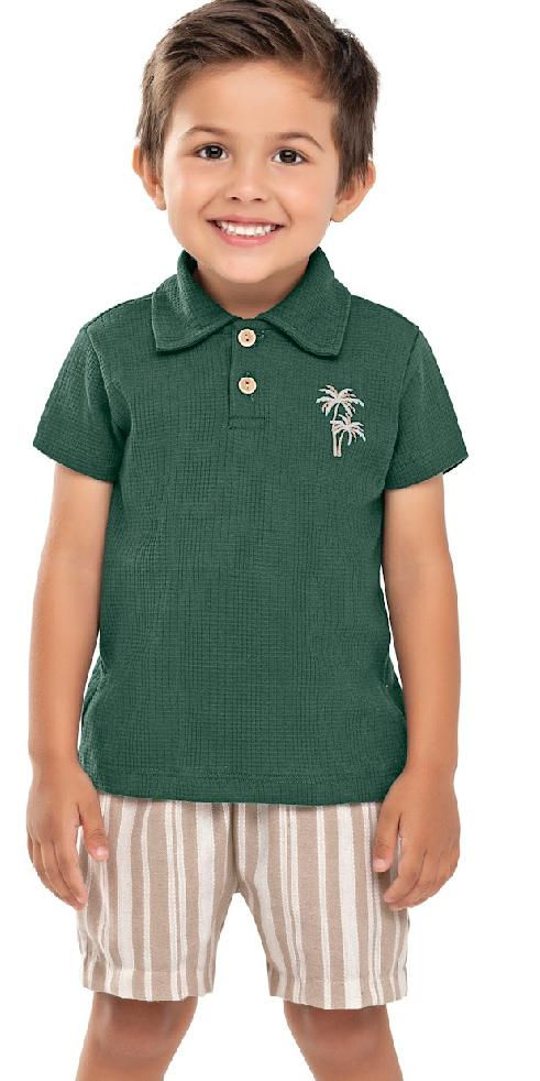 Conjunto infantil masculino com camiseta polo, detalhe bordado de coqueiro e botões frontais, combinado com bermuda bege listrada. O tecido leve e macio garante frescor e liberdade para brincar, passear e curtir o dia a dia com muito charme.