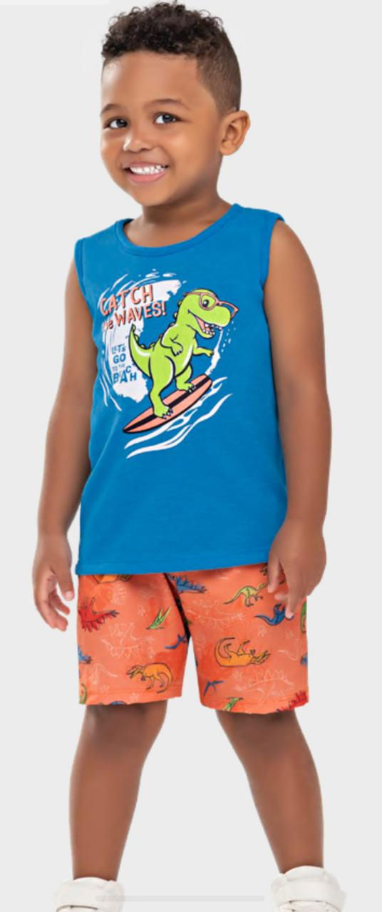 Esse conjunto infantil masculino traz a energia perfeita para os pequenos: regata com estampa de dinossauro surfista e bermuda vibrante com dinossauros coloridos. Confortável, alegre e cheio de atitude, é ideal para acompanhar as aventuras do dia a dia!”