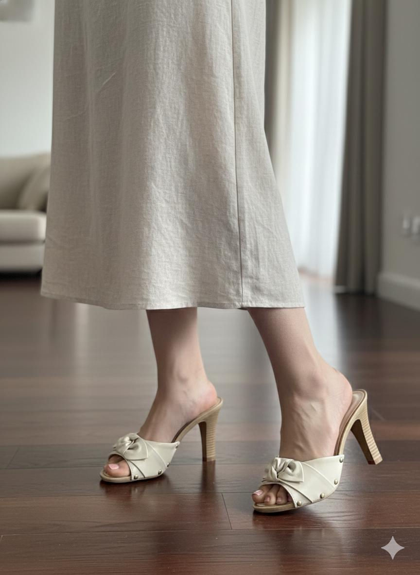 Esse tamanco é perfeito para quem ama um visual feminino, leve e sofisticado. Em tom off-white, ele se destaca pelo laço frontal estruturado, que traz charme e um toque romântico ao modelo.